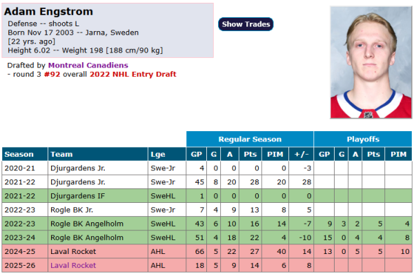 Notons que le Rocket ne jouera pas avant samedi prochain, ce qui fait en sorte qu'Engstrom ne perdrait pas trop de matchs si jamais le CH ne le faisait pas jouer sur la route dans la LNH.