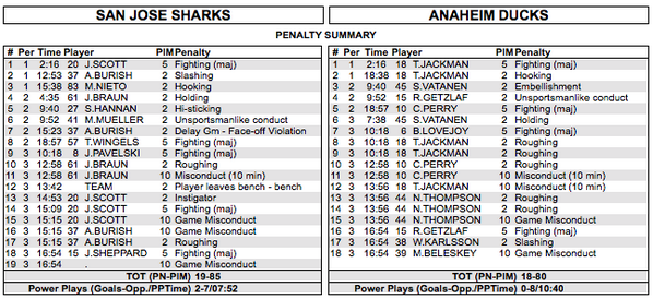 5. 5 matchs étaient à l'horaire hier, dans la LNH. Les Jets ont vaincu l'Avalanche en prolongation. Les Kings n'ont fait qu'une bouchée des Blue Jackets. Les Hawks ont battu les Sénateurs de justesse. Les Sharks ont surpris les Ducks, à Anaheim. Pas moins de 127 minutes de pénalité ont d'ailleurs été décernées en Californie! Et les Canucks ont eu le dernier mot, face à Barry Trotz et ses Capitals (malgré le 1er but en carrière dans la LNH de Liam O'Brien).