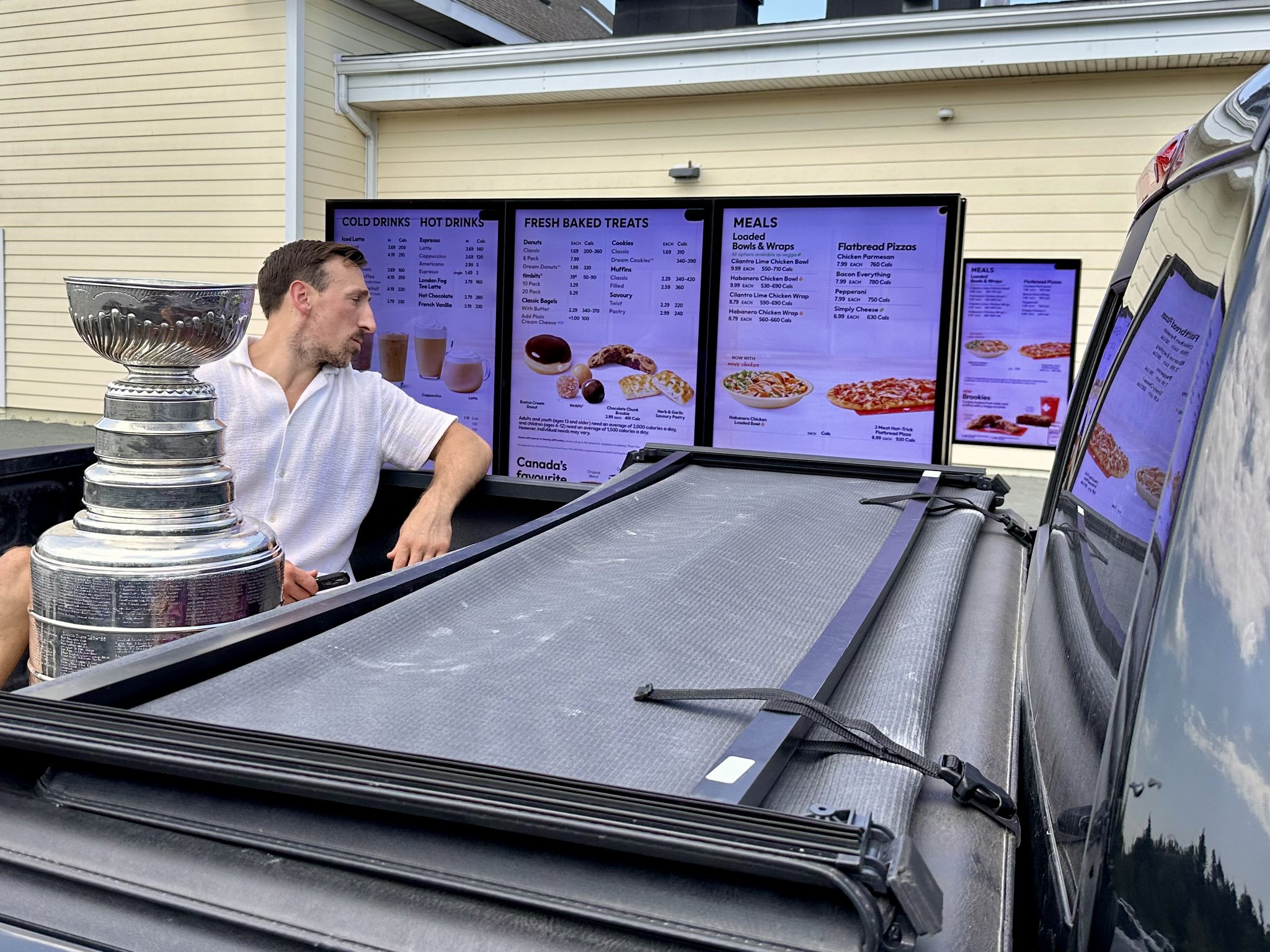 Et pour ce faire, il est arrivé au service au volant du restaurant en étant bien installé dans sa boîte de camion… avec la Coupe Stanley entre les deux jambes.