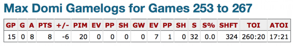 – En incluant ce soir, Max Domi n'a pas marqué à ses 16 derniers matchs, soit depuis le 9 décembre contre les Blackhawks. Il a vraiment ralenti. Au moins, ce soir, il a obtenu trois lancers vers Semyon Varlamov.