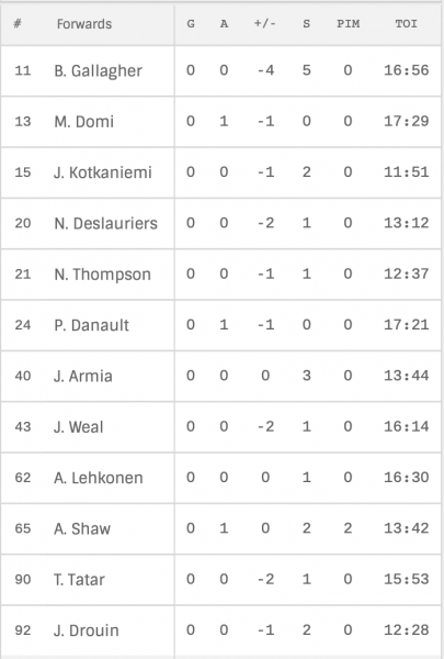 – À son retour au jeu, Nicolas Deslauriers n'a pas eu un effet positif sur son équipe, terminant avec un différentiel de -2 avec un peu plus de 13 minutes de jeu.