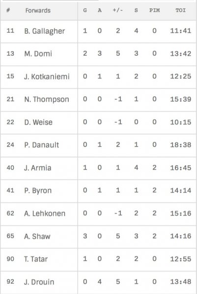 Le 6e but du match, enfilé par Andrew Shaw, a envoyé Jimmy Howard aux douches, au profit de Jonathan Bernier qui a disputé les 20 dernières minutes de jeu. Max Domi a ajouté à l'avance durant cette dernière période et Shaw a complété son premier tour du chapeau en carrière en fin de match.