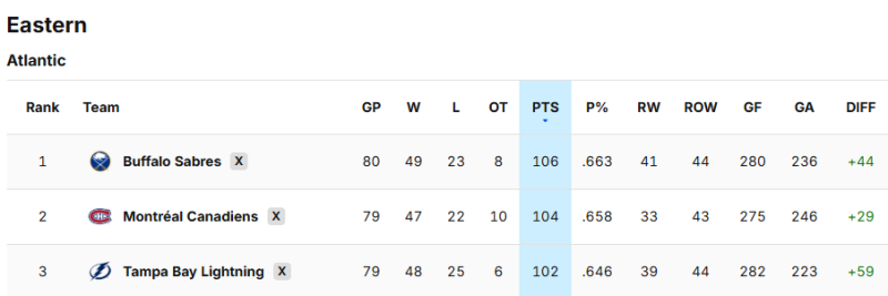 Cependant, si l'on se fie aux modèles mathématiques du site PlayoffStatus.com, les Habs devraient terminer au deuxième ou au troisième rang… même chose pour le Lightning.