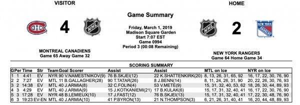 Enfin bref, même si le Rangers sont revenus dans le match, Paul Byron a permis à Joel Armia d'enregistrer son premier tour du chapeau.