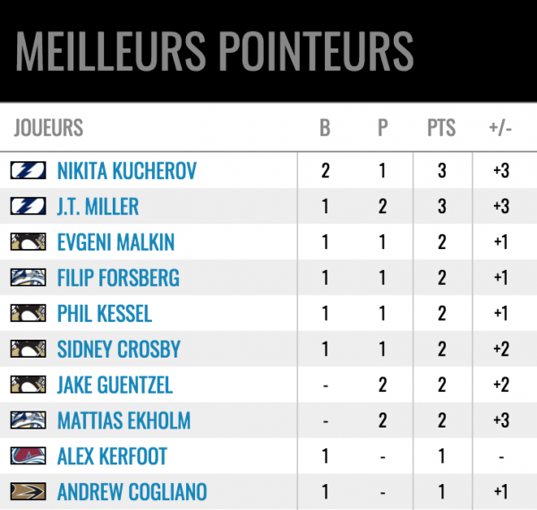 Il se nomme Nikita Kucherov. Un autre phénomène rare qui s'impose encore pendant qu'il y a un enjeu. J.T. Miller (3 points) et Steven Stamkos (1 passe) sont les seuls autres attaquants du Lightning qui ont noirci la feuille de pointage.
