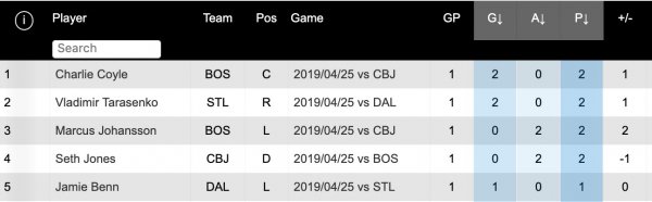 Malgré le jeu féroce des Stars, Jordan Binnington, qui est devenu le premier gardien de l'histoire des Blues à obtenir la victoire dans 5 des 7 premiers matchs en séries. Bel accomplissement pour celui qui inspire ses coéquipiers. Il a donc été l'un des artisans qui ont permis à son équipe de prendre les devants 1-0.