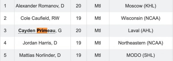Donc, Alexander Romanov est le premier membre de l'organisation du Canadien à se pointer le bout du nez, alors que le second figure au 10e rang et se nomme Cole Caufield. Qui d'autres que ces deux-là pour prendre une place parmi les dix meilleurs espoirs de la LNH?