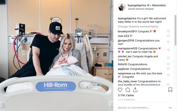 Peu importe, la nouvelle ici demeure la naissance de la deuxième petite fille (deuxième enfant, également) du couple Angela et Carey Price. Liv Anniston a 2 ans et demi, et Millie est fraîchement sortie du bedon de sa mère, à l'Hôpital général juif de Montréal. Elle est née hier soir, ce qui concorde avec le départ hâtif du cerbère numéro 1 de l'entraînement. Pas mal là que le travail a dû s'amorcer… Coïncidence? Embarquons pas là-dedans…