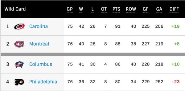 Les Hurricanes ont pratiquement assurés leur place en séries avec leur gain d'hier soir. Ils n'ont que 2,5 % de probabilités de terminer leur saison dans deux semaines.