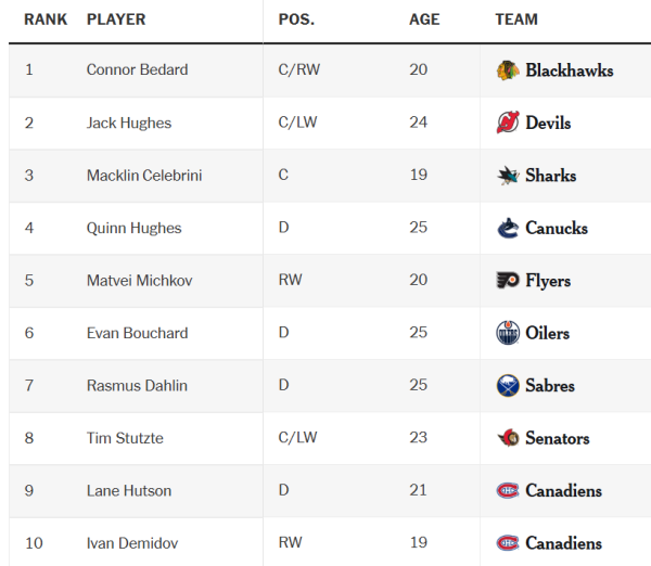 Rasmus Dahlin, Evan Bouchard et Quinn Hughes sont des défenseurs étoiles depuis quelques années déjà, malgré leur jeune âge et c'est encourageant de voir qu'Hutson suit tout juste derrière chez les défenseurs.