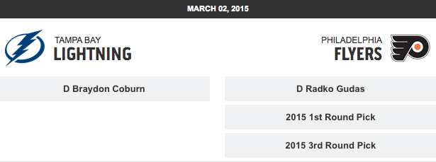 Il est vrai que le Lightning a chèrement payé les services de Braydon Coburn offrant leurs choix de 1re et 2e ronde, mais ils ont réussi à pallier ces pertes en mettant la main sur des choix de 2e ronde en 2015 et 2016. Puis, notons que le choix de 1ere ronde cédé aux Flyers vaudra presque une sélection de 2e tour.