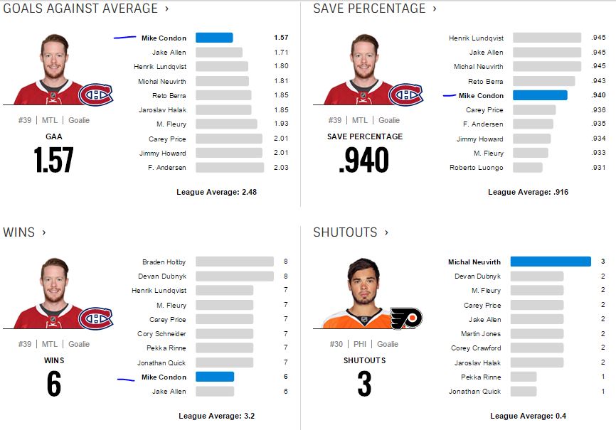 Mike Condon est tout simplement fabuleux, en l'absence de Carey Price. Il montre une fiche de 6-0-1 depuis le début de la saison… N'ayant toujours pas accordé plus de 2 buts lors d'une même rencontre! Dire qu'il est dominant est un euphémisme! #SurpriseDeLaSaison