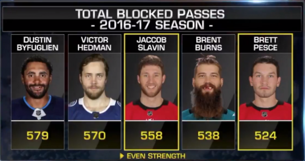 Encore plus important, Slavin s'est classé parmi les meilleurs de la Ligue pour les passes bloquées, suivi pas très loin derrière par son compagnon de paire Brett Pesce. Et les autres noms qui l'entourent, ce ne sont pas n'importe lesquels.