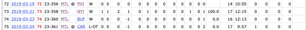 Pendant ce temps, Nate Thompson (15:47 de temps de jeu moyen ce week-end), Jordan Weal (13:49 de temps de jeu moyen ce week-end) et Artturi Lehkonen (16:52 de temps de jeu moyen ce week-end) ont eu droit à beaucoup de glace. Je ne dis pas qu'ils n'ont pas leur utilité, mais les probabilités que ce soit eux qui te donnent le gros but dans un moment critique sont plus minces.