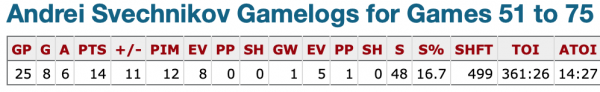 Andrei Svechnikov a marqué son 20e but hier, en prolongation, pour battre le Canadien. Avant la pause du match des Étoiles, il a récolté 22 points (dont 12 buts) en 50 matchs, durant lesquels il jouait 14 minutes en moyenne. Depuis ce temps, avec un temps d'utilisation légèrement supérieur, il a amélioré sa production.
