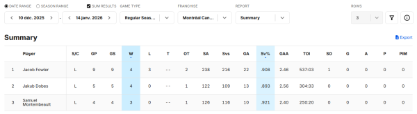 Notons que depuis le début de la saison, Dobes a 14 gains. Fowler et Montembeault en ont 12 ensemble.