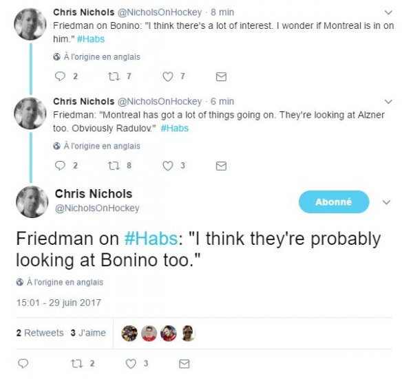 – Jordan Weal, Karl Alzner et Nick Bonino, qui ont tous visité Montréal cette semaine, sont toujours sur le radar du Canadien. Tout comme Alexander Radulov…