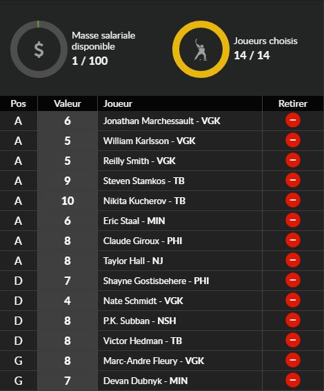 En investissant peu dans plusieurs joueurs performants des Knights, je parviens à économiser des points pour sélectionner des vedettes telles que Steven Stamkos, Nikita Kucherov, P.K. Subban et Victor Hedman.