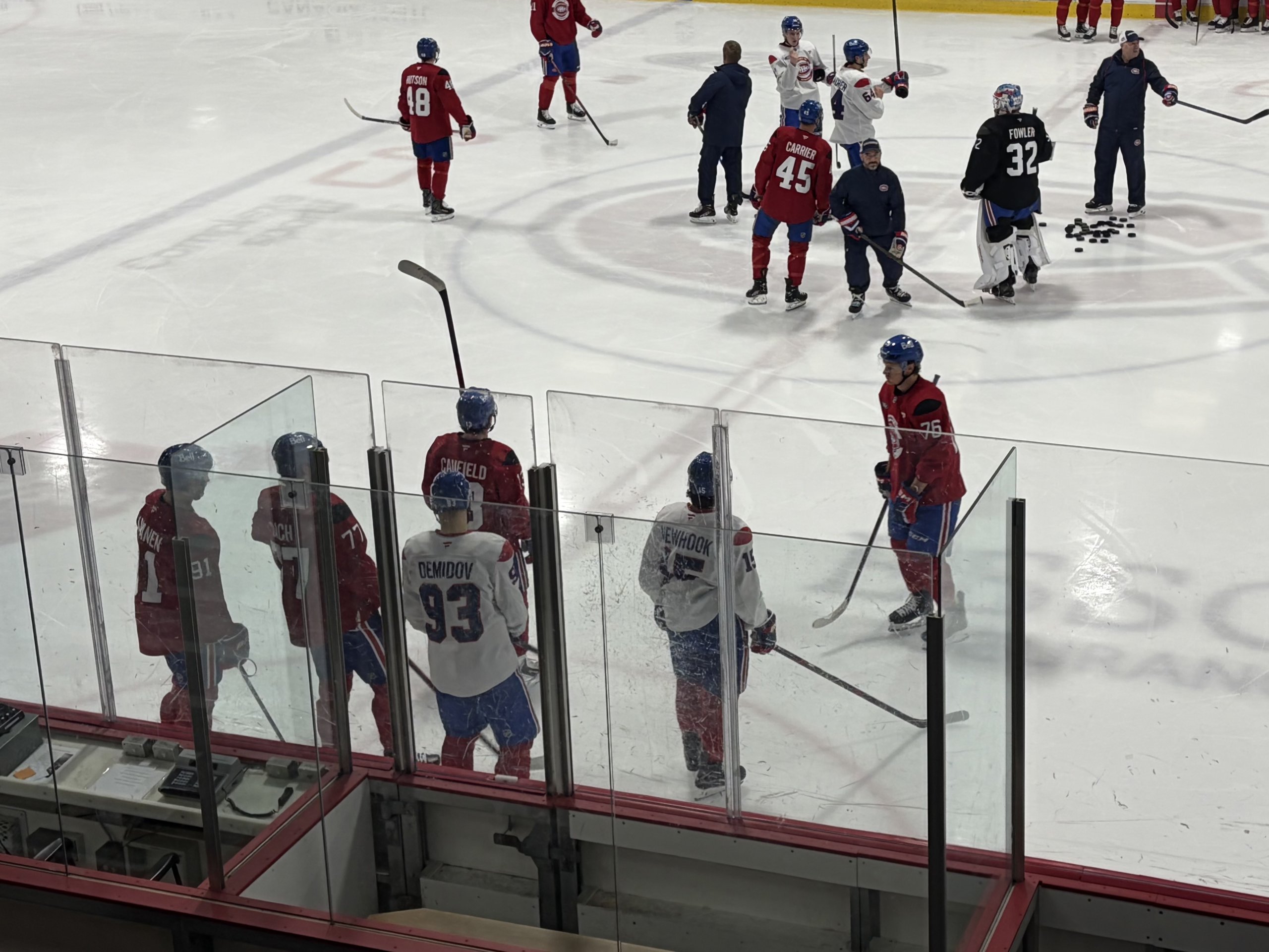 Nick Suzuki, Cole Caufield et Juraj Slafkovsky portaient du rouge tandis qu'Ivan Demidov, Alex Newhook et Alexandre Texier portaient plutôt du blanc.