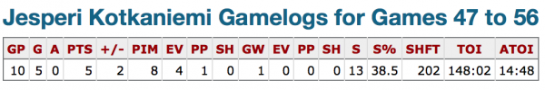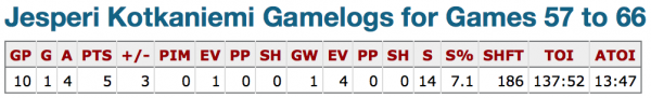 Dans les faits, la seule statistique notable dans le cas de Kotkaniemi, c'est que l'entraîneur a testé son jeune poulain en lui confiant un peu plus de temps de glace, avant de le réduire dernièrement.