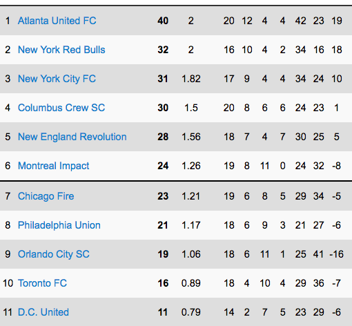 Actuellement en 6e place, l'Impact est très bien replacé dans la course aux séries. Orlando City SC se sort lentement mais sûrement de la course semaine après semaine, tout comme un Toronto FC qui ne semble plus avoir envie de gagner. L'Impact devra faire attention au Fire de Chicago et à l'Union de Philadelphie tout juste derrière, mais les Montréalais peuvent aussi logiquement commencer à regarder vers le haut. Le Revolution est un peu meilleur en 2018, mais il demeure le Revolution et je serais fort surpris de le voir maintenir cette cadence encore longtemps. Même le Crew de Colombus est dans une passe un peu moins bonne actuellement et pourrait éventuellement redescendre au classement. Le déménagement vers Austin se rapproche et pourrait affecter le moral des joueurs.
