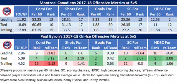 Tout compte fait, Byron reste efficace chaque fois qu'il se présente sur la surface glacée… alors que ses coéquipiers ne le sont peut-être pas toujours en zone défensive lorsqu'il est le moment de contrer les attaques adverses, alors que le Canadien est en avance au pointage. On ne joue pas de la même manière lors de ces circonstances.