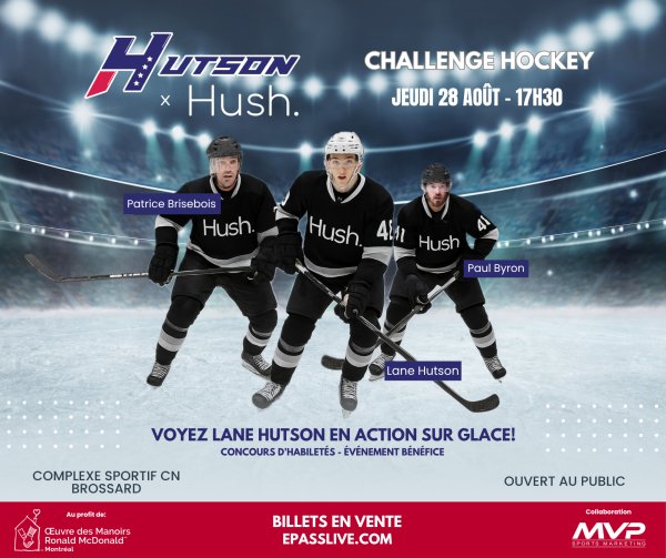 Hutson sera sur la glace du Complexe sportif CN à Brossard le jeudi 28 août dès 17h30 afin de participer aux Challenge Hockey Hush.