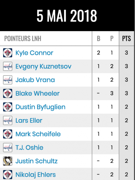 Le capitaine du club, pour sa part, a récolté un total de trois mentions d'aide. Mathieu Perreault, qui revenait au jeu, a enfilé son premier but des présentes séries.