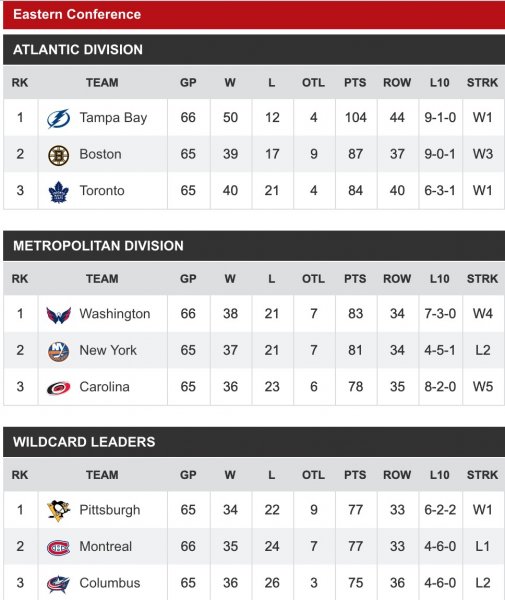 Un voyage crucial, mais le Canadien doit empocher des victoires afin de demeurer parmi les équipes repêchées. À ce moment-ci, Claude Julien et sa troupe doivent focaliser sur une seule chose : s'assurer du premier rang des équipes repêchées. C'est ça leur réelle mission. Voici d'ailleurs le classement actuel de la Conférence de l'Est :