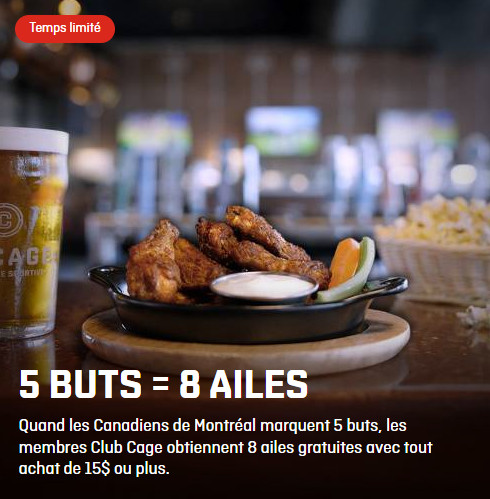 Les partisans du Canadien ont jusqu'à 21h30 ce soir pour réclamer leur huit ailes gratuites. Parce que oui, la promotion des huit ailes gratuites fonctionne toujours à La Cage, même si l'inflation est hors de contrôle depuis la pandémie.