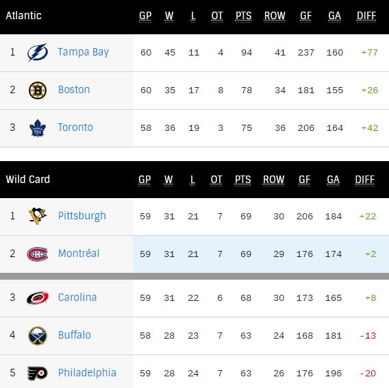 Les Maple Leafs ont aussi une bonne avance (six points et un match en main), ce qui laisse le Canadien seul avec les Penguins (69), les Blue Jackets (69) et les Hurricanes (68). Ai-je besoin de vous dire que le Canadien ne peut vraiment pas se permettre d'échapper son match de ce soir?