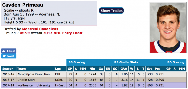 Cayden Primeau a une force mentale inébranlable et il l'a démontré à la suite de sa sélection au septième tour par le Canadien de Montréal. Il a été le 199e appelé (le dernier gardien recruté) sur la tribune en 2017… Quoique rendu là, on n'escalade pas la tribune. Peu importe. Avant cet encan, son nom devait sortir entre la troisième et la quatrième ronde, ce qui n'a pas été le cas. A-t-il été anéanti pour autant? Non!