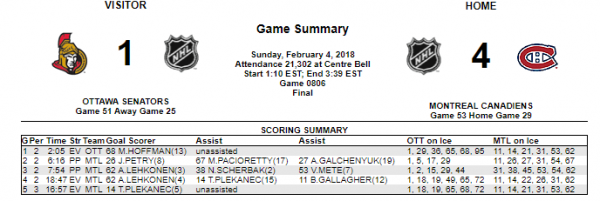 Dans le cadre du week-end du Superbowl, le Canadien jouait un deuxième match en deux après-midi. Le club s'était imposé hier face aux puissants Ducks d'Anaheim, sur le score de 5-2. Les Sénateurs étaient cette fois-ci de passage au Centre Bell, revenant de Philadelphie avec un gain en tirs de barrage, samedi.