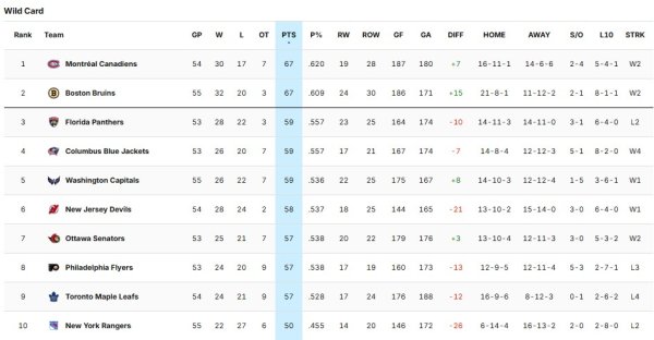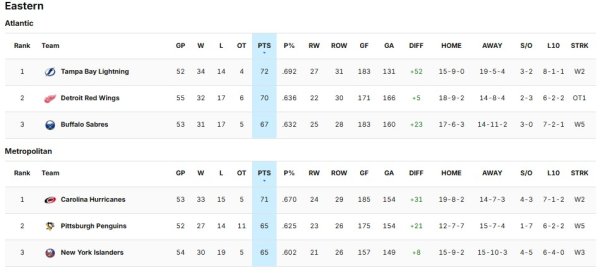Le classement est extrêmement serré dans la conférence de l'Est, alors que toutes les équipes, sauf les Rangers de New York, jouent pour plus de .500.