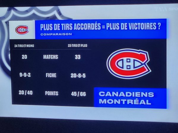 Ces stats datent d'avant le match face à l'Avalanche, qui a obtenu 29 tirs face au CH, ce qui rajoute donc une victoire en faveur de cette statistique.