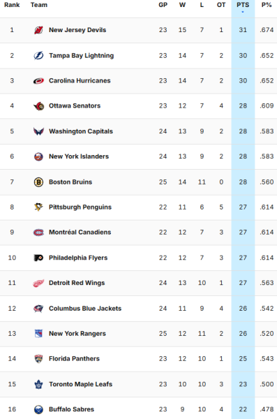Et ce qu'on remarque, dans l'Est, c'est qu'il y a pas moins de 10 clubs qui sont présentement séparés par seulement deux petits points au classement général.