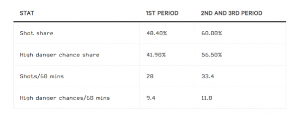 Jetez un coup d'oeil à ces statistiques avancées, qui en disent beaucoup sur l'efficacité des Golden Knights (par période) depuis le début de la danse printanière :