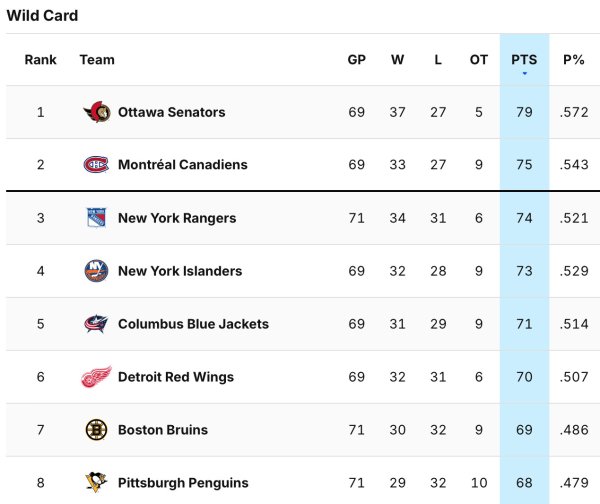Avec la défaite des Red Wings et des Bruins, le portrait dans l'Est ressemble à ceci, ce matin.