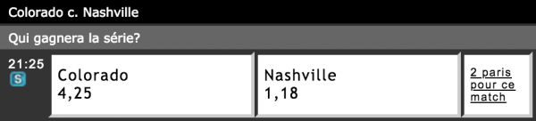 Les Prédateurs ont connu une saison incroyable et leur expérience de l'année dernière penche dans la balance. Ne sous-estimez toutefois pas l'Avalanche, qui pourrait représenter un coup de circuit au niveau des paris, si jamais ils l'emportent.