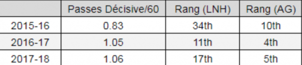 À travers un excellent billet du site The Athletic, on souligne justement cette facette du fiston de Tie. Vous saviez que sur les 66 mentions d'aide de Domi à force égale, 47 d'entre elles sont des passes décisives (et non une deuxième passe)? Dans cette colonne, son nom ne se situe pas trop loin du sommet, depuis deux ans, à travers la Ligue nationale. Pour un ailier gauche, il a terminé au 5e rang l'an passé et au 4e échelon, lors de la campagne 2016-17.
