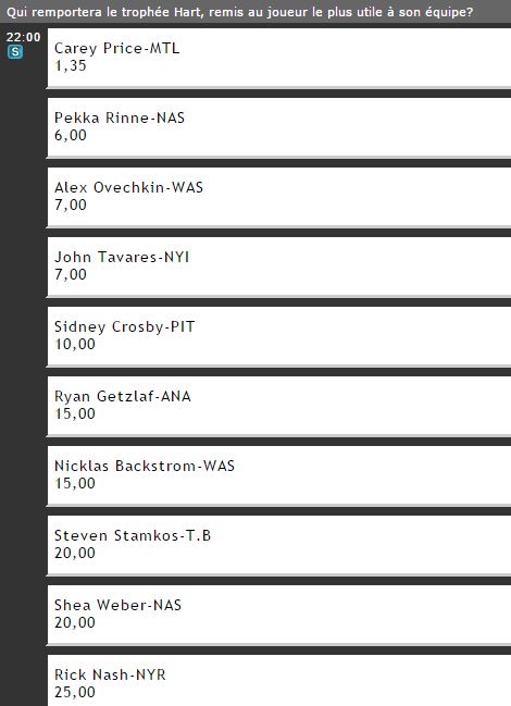Loto-Québec semble considérer que Carey Price remportera les trophée Vézina et Hart… Surtout le Vézina! #CoteUltraPetite