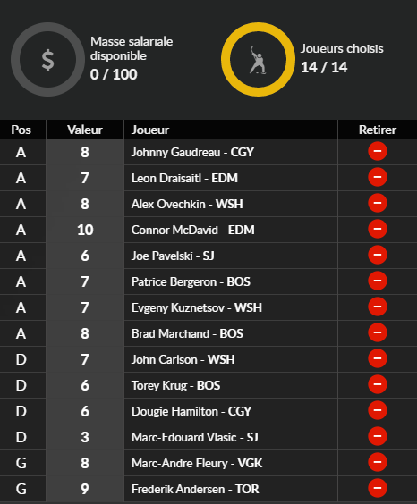 J'opte donc pour Frederik Andersen et Marc-André Fleury, deux cerbères évoluant dans des équipes gagnantes qui m'offrent de belles opportunités.