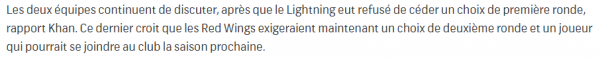 Khan ne fait que mentionner que les Red Wings aimeraient bien mettre la main sur ce fameux choix de premier tour, qui devrait en théorie se situer vers la fin de la première soirée du repêchage. Toutefois, si Steve Yzerman n'est pas willing de faire ça, le prix sera fixé à quelque chose aux alentours d'un choix de deuxième tour et d'un espoir.