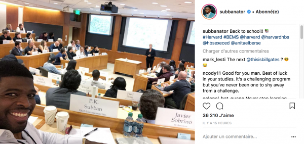 Du côté de la Ligue nationale de hockey, P.K. Subban a démontré lui aussi qu'il pouvait donner du temps sur un banc d'école et pas n'importe lequel. Non. On parle ici de l'Université de Harvard. Une petite session de Business of Entertainment, Media and Sports, qui consiste à assimiler le développement, la gestion et le marketing d'un produit de divertissement.