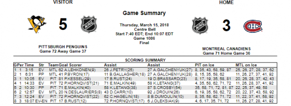 Les joueurs adverses étaient donc très raplapla en début de match, et le CH en a profité en marquant deux buts grâce à Lehkonen et Byron. Néanmoins, les Pens se sont repris alors que les filets de Phil Kessel et Patric Hornqvist ont ramené les deux formations à la case départ.