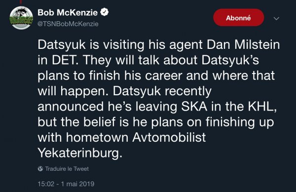 MISE À JOUR – Datsyuk visite son agent à Detroit. Ils vont discuter du plan pour sa retraite et où il veut finir sa carrière. Il a récemment quitté le SKA dans la KHL, mais le plan serait de terminer avec l'équipe de sa ville natale, l'Avtomobilist d'Iekaterinbourg.