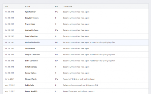 Ce que vous pouvez voir ci-dessus, ce sont les récentes transactions/signatures faites par Lou Lamoriello, DG des Islanders. C'est assez tranquille, comme on peut le voir… Ceci dit, l'équipe aurait encore 17 670 812 $ pour signer leurs gars en vue du début de la prochaine saison, selon le site Cap Friendly.