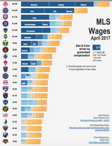 22,5 millions en salaires contre un peu plus de 5 millions pour l'Impact de Montréal. Même si ces chiffres ne sont pas exacts, surtout depuis le renouvellement de contrat de Nacho Piatti, la différence entre les deux clubs est abyssale. Les seuls contrats d'Altidore, Bradley et Giovinco valent plus que l'entièreté de l'effectif de l'Impact. Ça ne fait pas tout, mais ça aide.