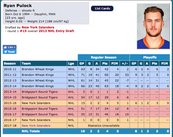 À la lecture des infos sur Ryan Pulock, il est permis de se demander si le jeune défenseur ne pourrait pas être une belle cible pour le Tricolore. Pulock est droitier, il mesure 6 pieds 2 pouces, pèse 214 livres et a été repêché au 15e rang au total lors du repêchage 2013 de la LNH. Il a connu beaucoup de succès dans la WHL et son jeu offensif s'est poursuivi une fois gradué dans la Ligue américaine de hockey, ce qui n'est pas banal tout de même. Même si son coup de patin n'est pas fameux, il fait une bonne première passe et possède un bon lancer, ce qui lui permettrait de faire mieux que Benn, Davidson et Morrow, peut-être patrouiller une deuxième unité d'avantage numérique et passer une quinzaine de minutes par match sur la glace. Il a disputé seulement 16 parties en carrière dans la LNH, même s'il est âgé de 23 ans déjà, mais le talent est tout de même présent. Actuellement, outre Jeff Petry et Shea Weber, Montréal ne dispose pas d'arrière droitier capable d'effectuer une bonne relance sur la troisième paire de défenseurs et la venue de Pulock pourrait être une très bonne option. En fait, le CH n'a que Mete pour faire la même chose sur le flanc gauche, c'est dire à quel point ça ne va pas bien. Évidemment, tout dépend du prix, mais si le fit est là, Bergevin doit tenter le coup avec Pulock, car en ce moment, rien ne va plus en défensive chez le CH, pourquoi ne pas essayer ?