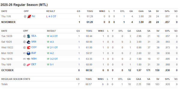 Mais de l'autre côté, Jakub Dobes a été la troisième étoile de la LNH en octobre… et il n'a joué qu'un seul match en novembre, pour le moment. C'était le 6 novembre, au New Jersey.